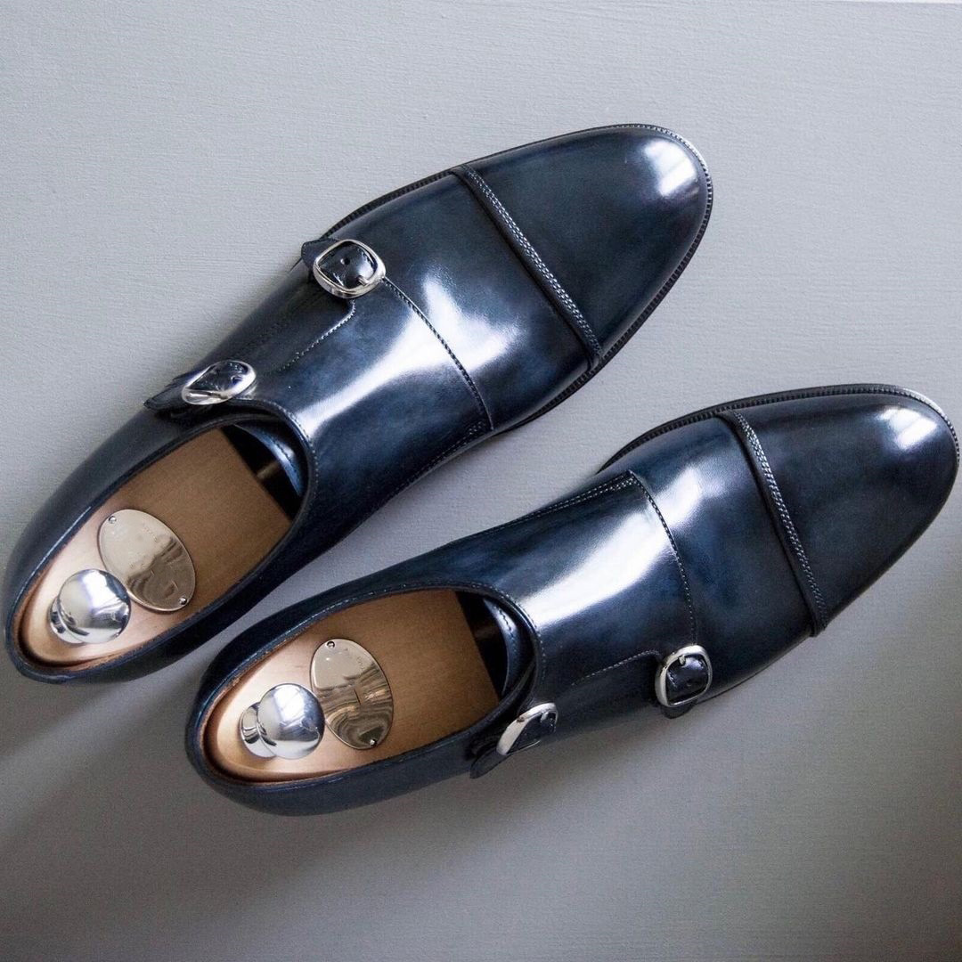 Navy Blue Leather Plovdiv Toe Cap Double Monk Straps
